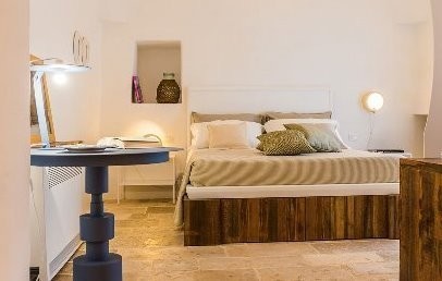 Dal recupero dei 42 trulli del borgo sono state ricavate 15 camere e suite, ognuna delle quali ha mantenuto le originali caratteristiche strutturali. Tutti diversi, i trulli vanno dai 18 ai 35 mq e sono caratterizzati da uno stile avvolgente che riprende i materiali e colori della tradizione.